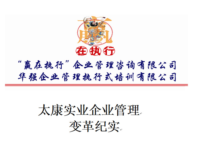 为提升企业管理水平,经过多方考证,决定聘请广州“赢在执行”来我司进行管理变革。2006年4月8日,在孙老师的带领下,以罗执老师、海滨、梁书萍老师 为首的专家团队正式进驻公司,历经7个月、210多个日日夜夜的奋战,太康实业在“阵痛”中完成了一场脱胎换骨的转变,一个有章可循、团结协作的太康实业 团队就像一匹“黑马”,在塑胶五金行业中脱颖而出,成为佼佼者,太康实业产品在市场上赢得良好的口碑。管理变革带给太康实业太多的收获,具体如下: