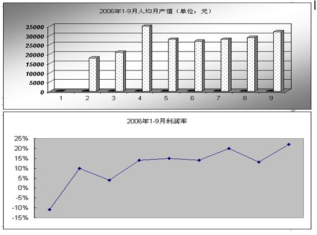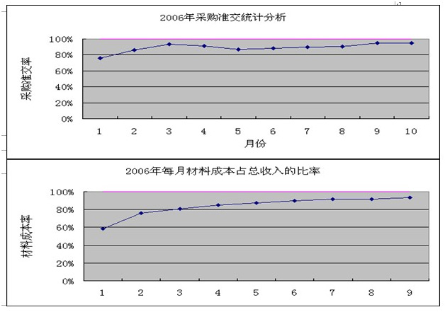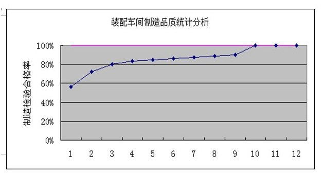 从中可以看出2006年以来企业的制程合格率在逐月上升,由项目进入时的69.49%上升到10月份的97.37%,直通率上升了27.85%,这意味 着返工率下降了27.85%,如果原来一个月的产量是30000箱的话,也就意味着企业至少可以多生产7395箱,达到37395箱,这也说明了提升产量 的同时要注意对品质的控制,只有产量和品质同步发展,才不会造成产量上升、成本也跟着大幅上升这种局面的产生,而且这个数据才是真正为企业控制和利润上升 做了保障。