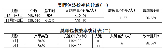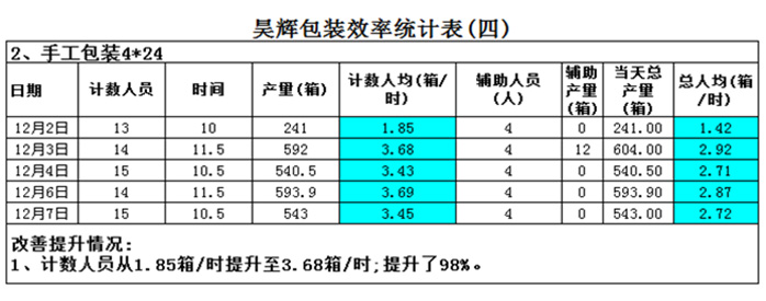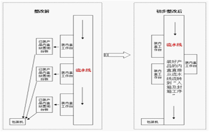 经整改优化,按新方法进行运作,成效显著:缩减内盒周转放置空间,减少包装员工的回来搬运劳动量,使流水线运行更加紧凑,增加了作业协调性。