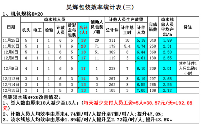 在此基础上,后续重点又从流水线人员排布,操作动作上来进行优化,使生产效率进一步得到了提升。相关数据如下: