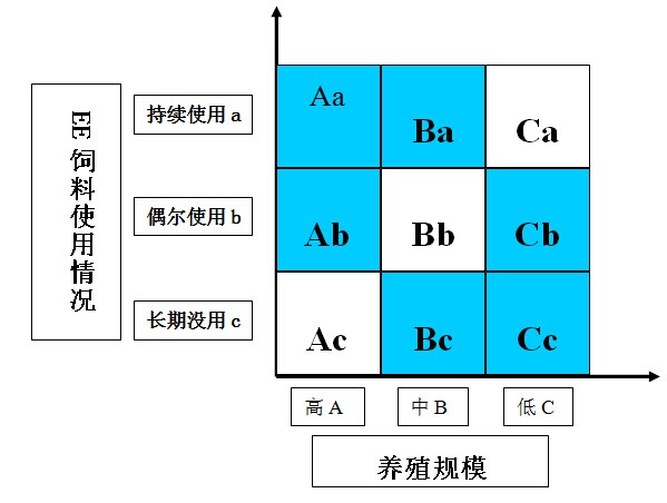 对顾客进行分等的目的是寻找并争夺重要顾客。养殖规模考查的指标为现存栏总数。依据养殖规模,将养殖户分为A、B、C三类,其中各类养殖户养殖总规模分占目标村总规模的1/3左右。预计各类养殖户数分别占目标村养殖总户数的10%、30%、60%。同时,依据使用正大饲料的情况将养殖户分成a、b、c三级。持续使用正大饲料的忠诚客户,为a级;偶尔使用,即一年内使用过正大饲料的,为b级;长期没用,即一年没有使用正大饲料的,为c级。依据以上两个指标,将目标村全部养殖户分为三等: