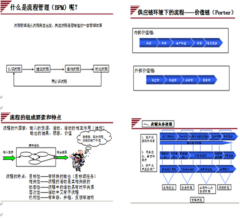 企业管理流程是 指为了完成某一目标和任务而进行一系列相互关联的活动、决策、信息流和物流的集合。企业流程是在传统分工理论基础上,把一系列独立的活动按照一定的顺序结 合而成的。这些流程都是在一定技术经济条件和管理水平下的产物。对于一个企业而言,为了保证生产经营活动正常运行,要制定许多管理流程、营业流程,如企业 中管理是按传统的职能的分工进行的,企业分设生产、供应、销售等不同的部门,每一个部门只负责其职能范围内的工作。这种组织结构导致了完成任何一项任务的 业务流程都被众多的职能部门分解得支离破碎,不仅造成了部门之间衔接协调上的困难,还会形成许多重复劳动,其最终结果是大大延长了任务完成的周期和影响了 任务完成的质量。因此通过流程再造及优化提高工作效率,以增强企业竞争能力显得非常重要。